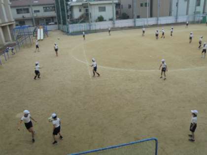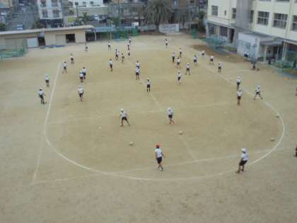 運動場で、サッカーをがんばっています。子どもたちも、担任の先生方も、元気です!