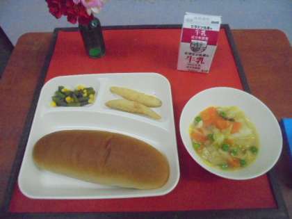 今日の献立は、わかさぎフライ、スープ煮、三度豆とコーンの甘酢あえ、パン、牛乳です。