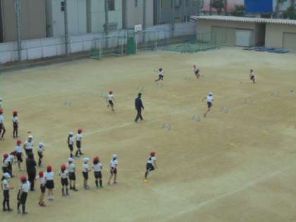 運動場で、体力づくり。ミニハードルを跳びこしています。
