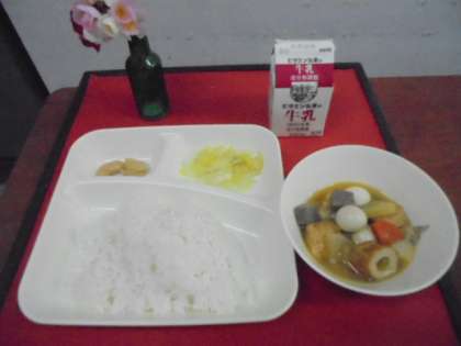今日の献立は、関東煮(個別対応献立:うずら卵)、はくさいの甘酢づけ、白花豆の煮もの、ごはん、牛乳です。