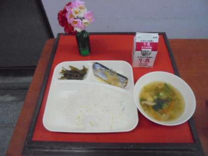 今日の献立は、さんまのみぞれかけ、すまし汁、茎わかめのつくだ煮、ごはん、牛乳です。