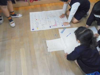 (上)国語の学習で、アンケートを模造紙にまとめています。