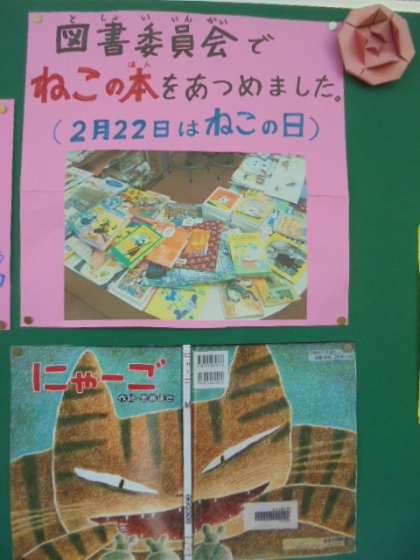 今日は、ねこの日です。学校図書館補助員の小前先生が、ねこの本を紹介してくださっています。(「ニャーゴ」は、2年生が国語で勉強中の絵本です)