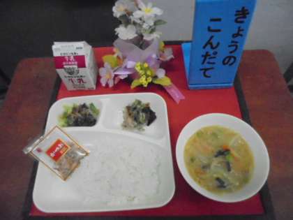 今日の献立は、豚肉のごまだれ焼き、みそ汁、こまつなのおひたし、ごはん、牛乳です。
