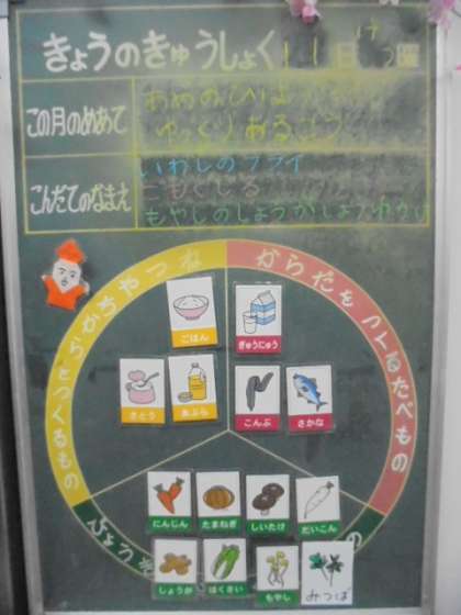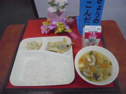 今日の献立は、いわしのフライ、五目汁、もやしのしょうがじょうゆかけ、ごはん、牛乳です。いわしは、給食調理員の皆さんが一匹ずつ揚げてくださった逸品です。