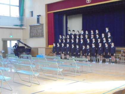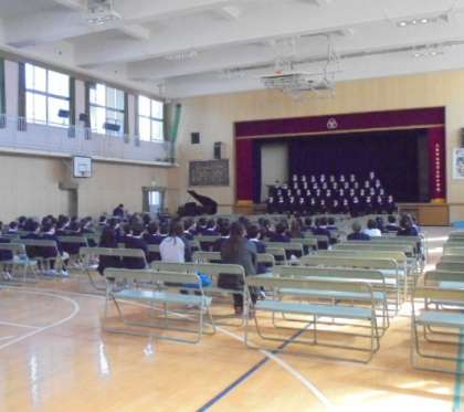 1年生が6年生の呼びかけを聴いています。素晴らしいお手本です。