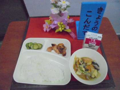 今日の献立は、鶏肉のチリソース焼き、中華煮、きゅうりの中華あえ、ごはん、牛乳です。