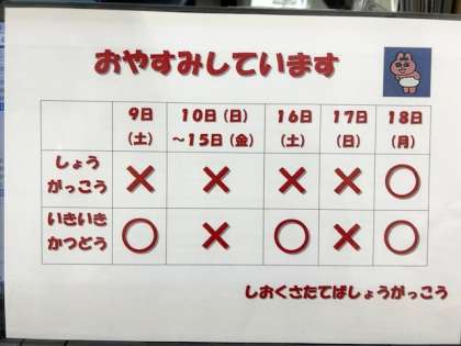 塩草立葉小学校は、今日から8月17日(日)まで閉庁します。18日(月)より業務を行いますので、どうぞよろしくお願いします。