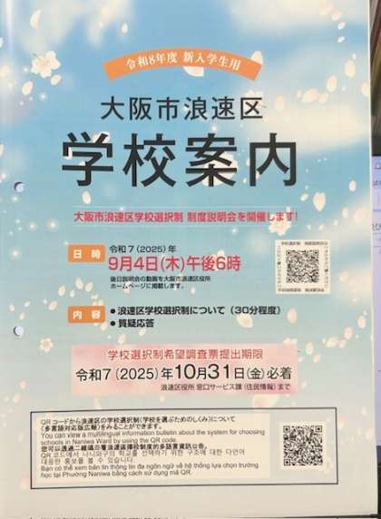 6年生の子どもたちに、中学校の学校選択制にかかわる学校案内冊子を配りしました。必ずお読みいただき、浪速区の区立中学校への進学を志望される方は、10月末までに浪速区役所窓口サービス課へ希望調査票を提出してください。