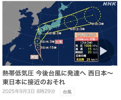 熱帯低気圧が台風に変わり、5日(金)前後、近畿地方に近づく可能性があります。進路がそれたり、弱まったりすることもありますが、念のため安全には十分お気をつけください。