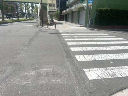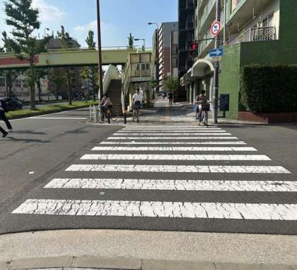写真は、小学校前の歩道橋につながる横断歩道です。朝の登校時、多くの自転車が子どもたちが通っている横断歩道を走っています。特に、上野砂糖からグリーンマンションへ向かって横断歩道を渡る際に、自転車と子どもたちが接触しないか心配です。