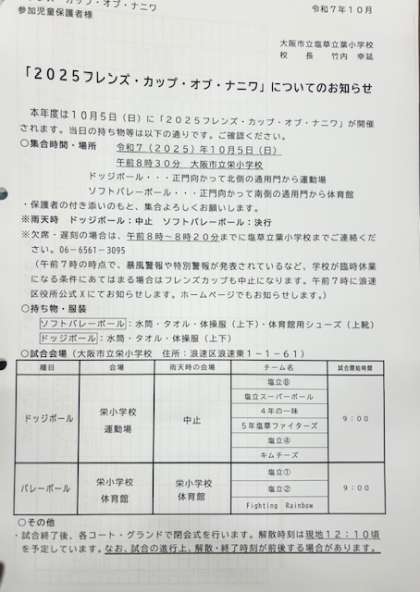 雨天のため、今日のドッジボールは中止との連絡が入りました。バレーボールは、行われます。詳しくは、先日お配りしたプリントをご覧ください。