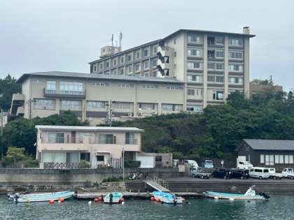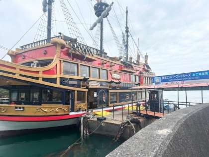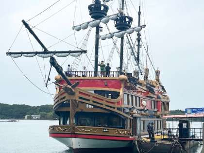 ホテルをあとにして、鳥羽湾クルーズ船に乗りました。海賊船のようなかっこいい船です。船からは、ホテルみち潮も見えました。