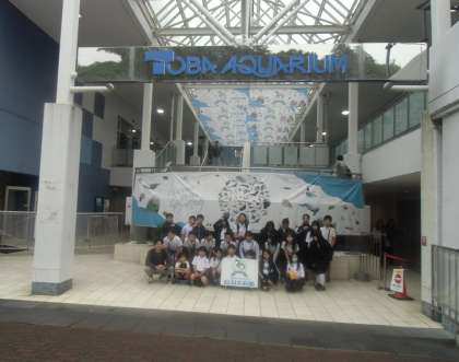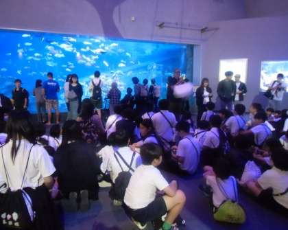 鳥羽水族館に着きました。クラスごとの集合写真を撮りました。メインの水槽が、とてもきれいです。