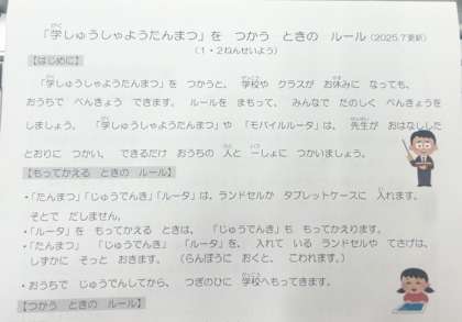 子どもたち一人ひとりにお貸ししている「学習者用端末(タブレット)」の使い方ルールをまとめています。卒業までこわれることなく使えるよう、ご協力をよろしくお願いします。