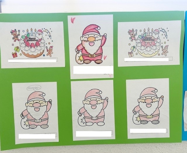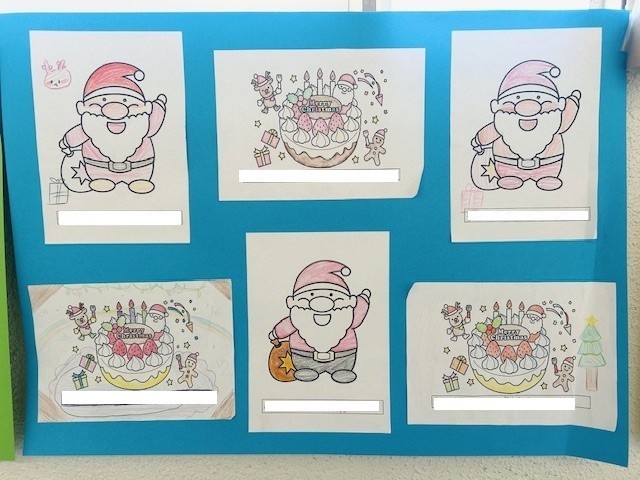 職員室前のろうかに、サンタさんの塗り絵を貼っています。子どもたちが描いてくれました。気持ちいいね。ありがとう。