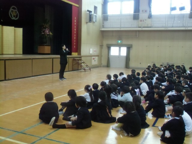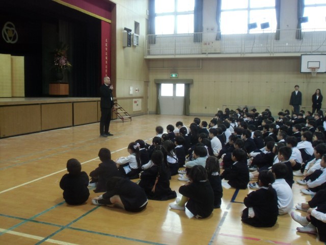 3学期最後の朝です。1年生から5年生までの子どもたちが、講堂に集まりました。修了式のあと、通知表をもらって帰ります。みんな、1年間よくがんっばったね。