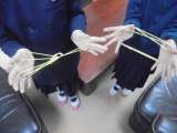 (上)算数「図形」の学習です。 (下)図画工作の作品に、ニスを塗っています。