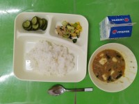 今日の献立は、ごはん、牛乳、豚肉の甘辛焼き、豆腐のみそ汁、じゃこピーマンです。給...