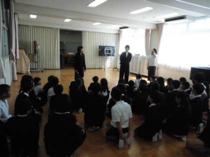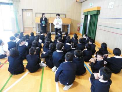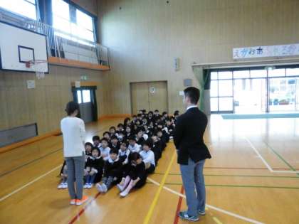 各学年ごとに講堂や多目的室でクラス分けを行いました。