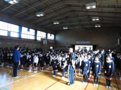 月曜日の朝は、講堂で全校児童が集まっての児童朝会です。