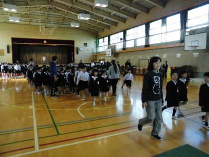 8時25分のチャイムが鳴ったら、各教室前で集まった子どもたちが講堂に向かって行進します。