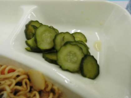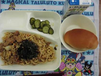 献立は、焼きそば、きゅうりのしょうがづけ、パン、牛乳でした。