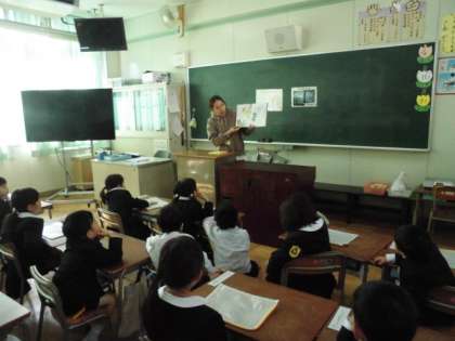 火曜日の朝の時間は、読書タイムです。そして、今日からは、本の読み聞かせで図書館ボランティアの方に来ていただいてます。
