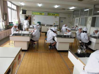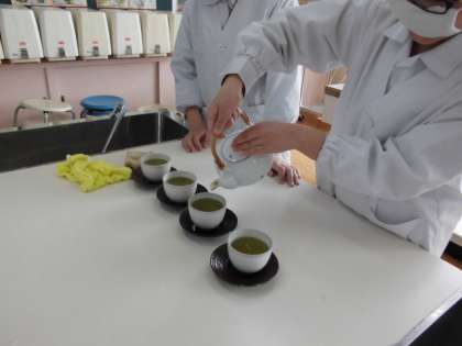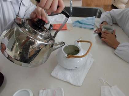 5年生が家庭科の勉強でガスこんろを使い、やかんでお湯を沸かしました。そして急須を使い日本茶を飲みました。初めて急須を使ったという児童もいました。