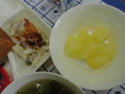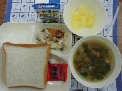 献立は、マカロニグラタン、レタスのスープ、りんご(カット缶)、いちごジャム、パン、牛乳でした。