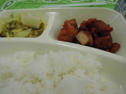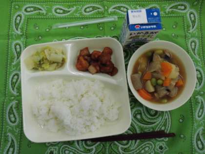 献立は、まぐろのオーロラ煮、じゃがいもと野菜の含め煮、キャベツの梅風味、ごはん、牛乳でした。