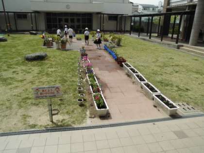 さわやかな風が通る中庭に、2年生が植え替えた人権の花(ペチュニア・ノースポール)が揺れています。