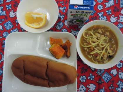 献立は、カレースープスパゲッティ、焼きかぼちゃ、甘夏かん、パン、牛乳でした。