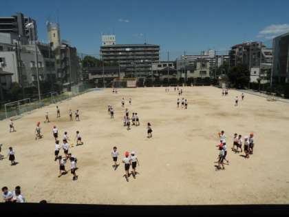 4時間目の始まりのチャイムが鳴り、急いで運動場から帰ってくる子どもたち。