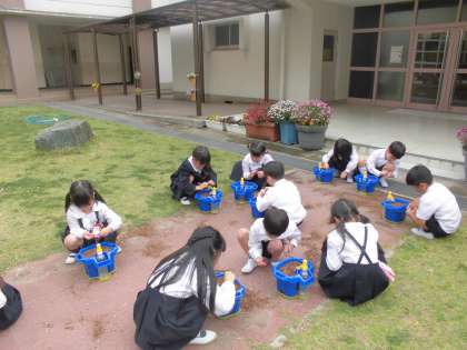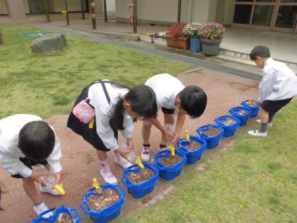 5.9 木 9:00 1年生 アサガオの種を植えました