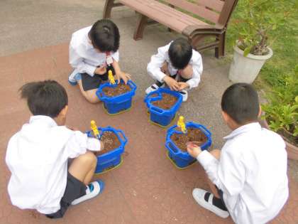1時間目に1組の子どもたちがアサガオの種を植えました。