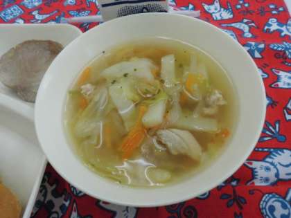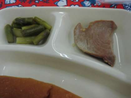 献立は、かつおのガーリック焼き、鶏肉とじゃがいものスープ、グリーンアスパラガスのサラダ、パン、牛乳でした。