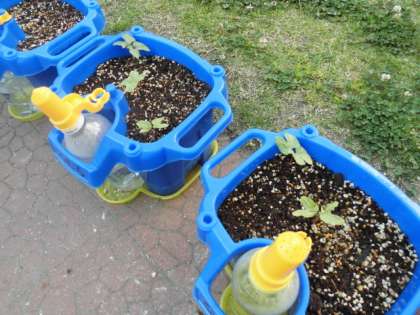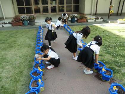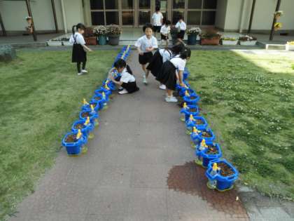 水やりをしながら、アサガオに愛情を注いでいる1年生の子どもたちです。