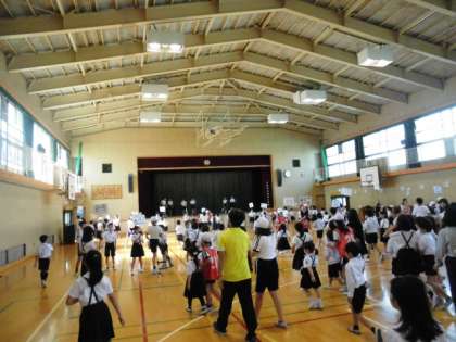 8時25分のチャイムが鳴ると校内放送で児童集会の案内があります。