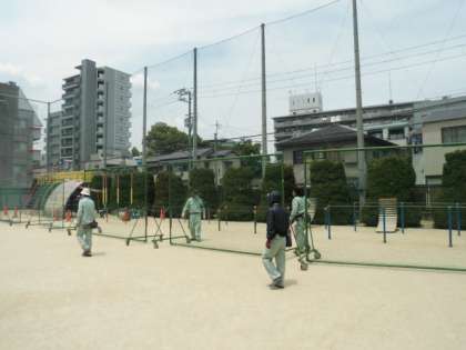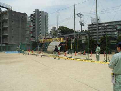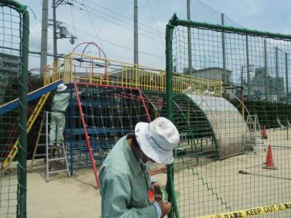 管理作業員グループの皆さんに固定遊具の塗装作業をしていただいています。