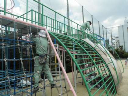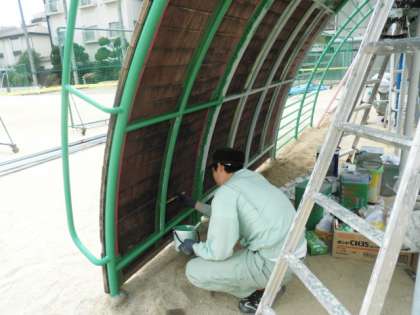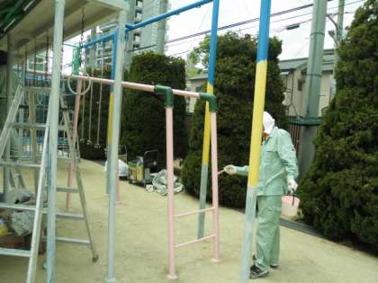 今日も、朝から固定遊具の塗装作業をしていただいています。