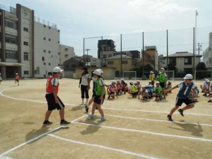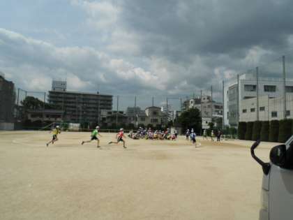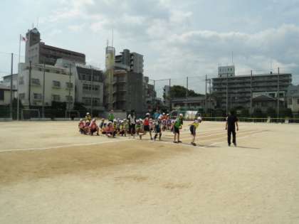 運動場へ出て来る前に講堂で、準備運動として、「足が速くなるダンス」をしていました。