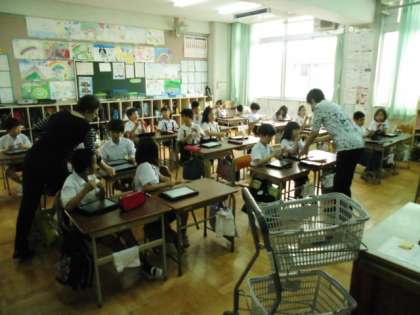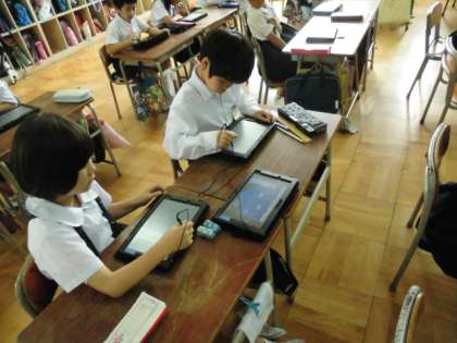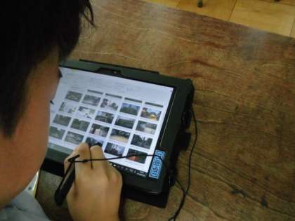 先日に行った町探検の際にタブレット端末で撮影し保存していた写真を画面にそれぞれ表示していました。