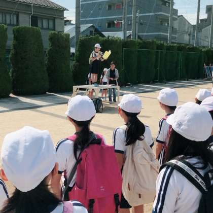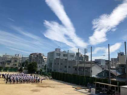 爽やかな青空の下、全校オリエンテーリングに出発です。