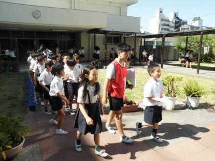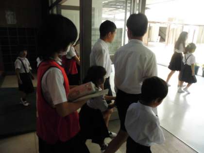 高学年の子どもたちが、低学年の子どもと自然な様子で手をつないで教室へ向かっていました。