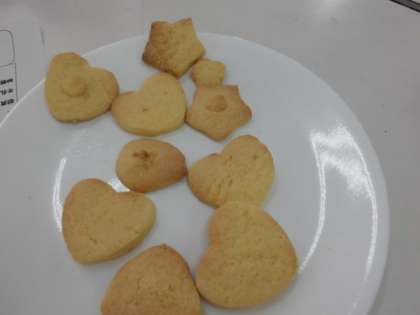 メイキングクラブの調理実習でクッキー作りをしました。ホットケーキミックスの粉とマーガリン、砂糖、卵黄で作ります。かわいい形のクッキーができあがりました。