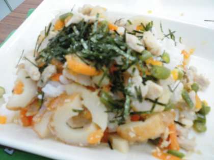 かやくごはんには、きざみのりをかけていただきました。抹茶ういろうも、手作りで抹茶の風味があり、とてもおいしくいただきました。