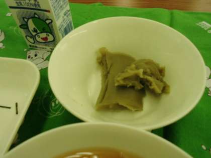 献立は、かやくごはん、みそ汁、抹茶ういろう、牛乳でした。