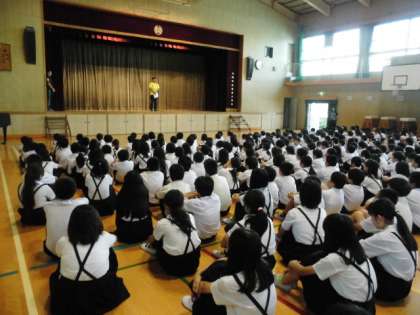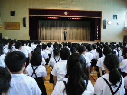 成藤先生からは、校内ですれ違ったときにも素晴らしい挨拶をする児童の名前が紹介されました。他にも、気持ちの良い挨拶のできる子どもが増えてきていること、自分から進んで学校の約束を守る子どももいることなどの話がありました。