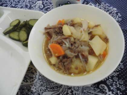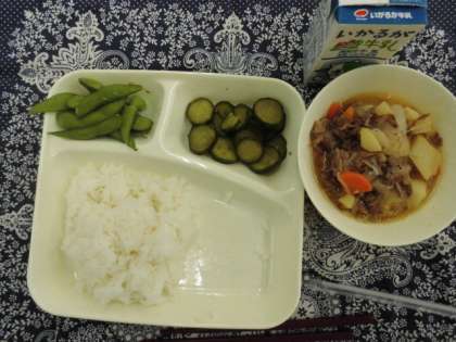 献立は、肉じゃが、きゅうりのかつお梅風味、枝豆、ごはん、牛乳でした。